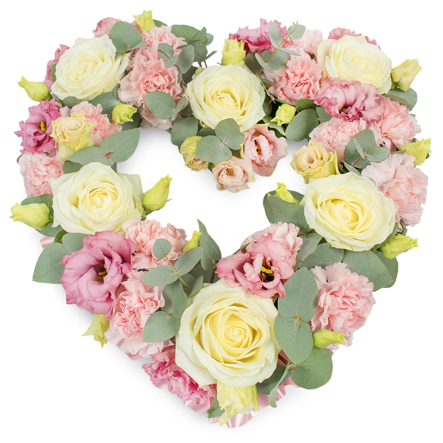 Express your heartfelt condolences with our exquisite open heart sympathy arrangement. This elegant bouquet combines white roses, soft pink carnations, and graceful pink lisianthus, complemented by fresh eucalyptus leaves for a serene presentation.